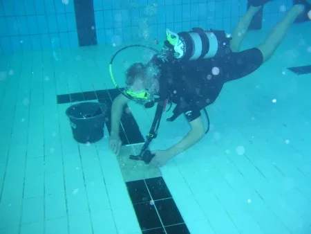 Mit Tauchausrüstung und geeignetem Luftdruckwerkzeug lassen sich beschädigte Fliesen ausschneiden, rausstemmen und mit speziellen Unterwasserklebern einsetzen und verfugen